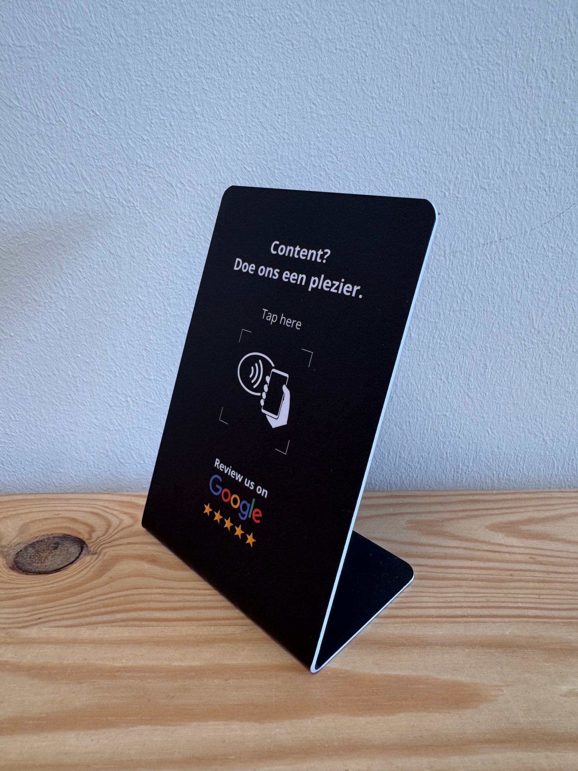 De speelse zin “Content? Doe ons een plezier” maakt het luchtig en laagdrempelig.